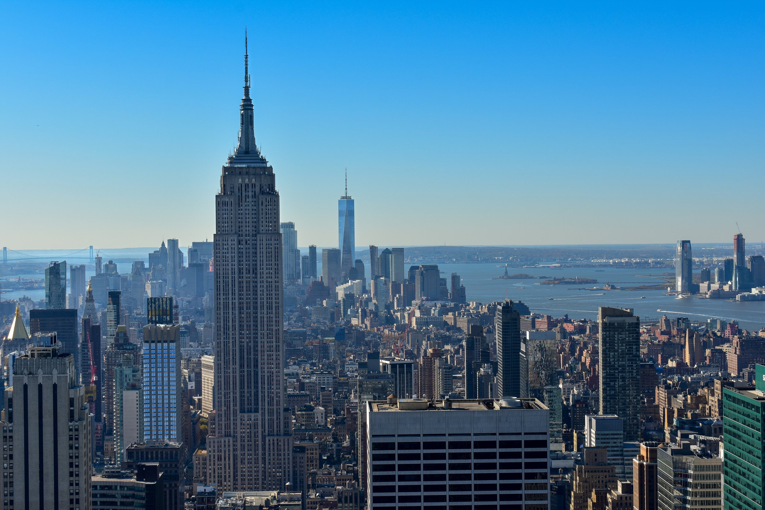 The South view from the Top of the Rock featuring the Empire State Building, One World Observatory and Statue of Liberty in the background