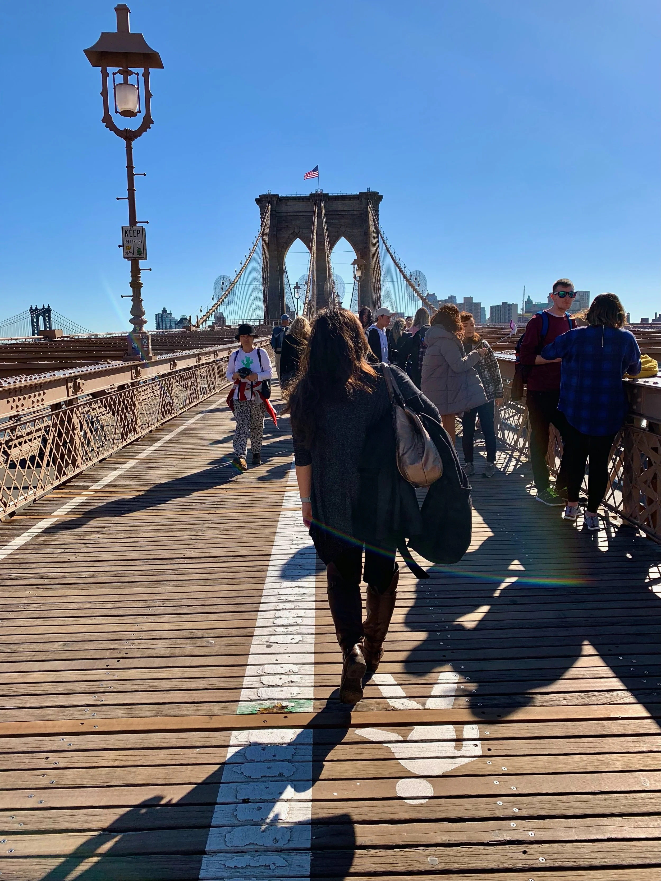 Walking across the Brooklyn bridge from the Manhattan side